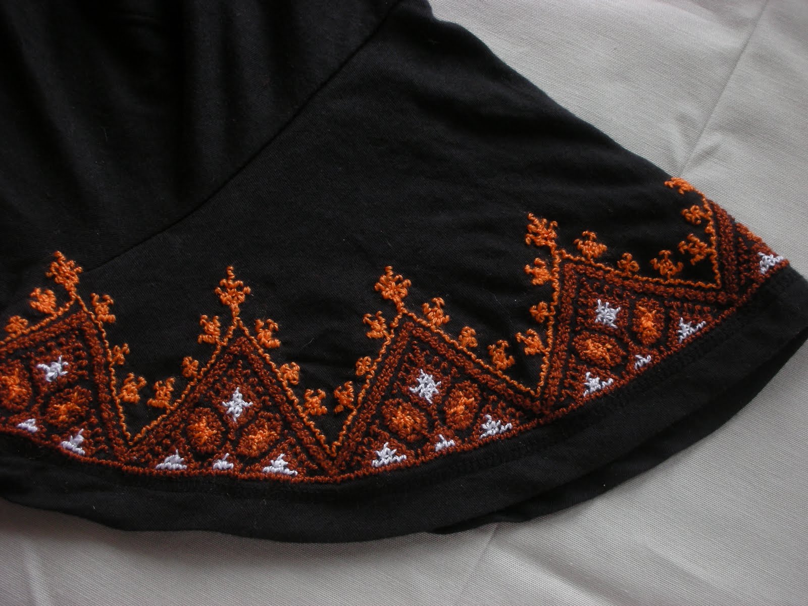 When Heather picked up the fabric strips in June she gave me several t-shirts to have the women embroider on. She consulted with her sister about what colors and designs they wanted on which color t-shirts, drew up some sketches, and placed their order for embroidered t-shirts. Below is a picture of Hafida (center) with Katie (left) and Heather at the Marché Maroc Craft Fair in Fes in October 2009. These shirts are two of the first ones that they made.